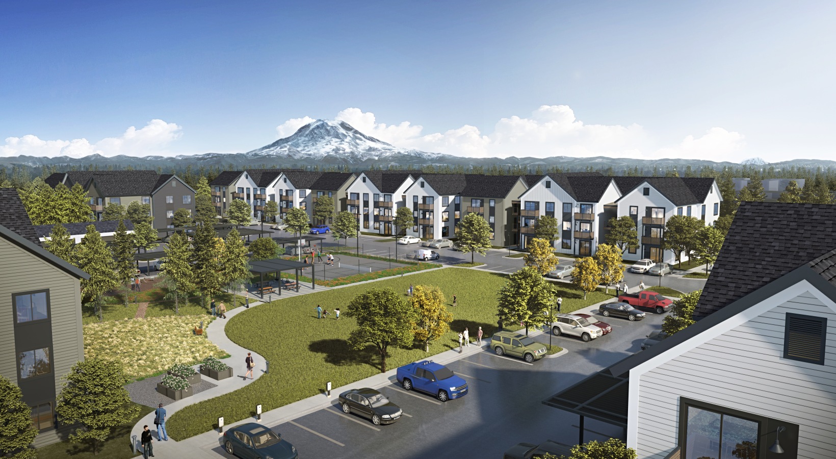 The gallery also gives you a glimpse into our community’s character. Preview the garden-style landscapes, a central park, and inviting outdoor spaces that encourage gathering, play, and relaxation. From the pool and fitness center to coworking lounges and sports courts, every detail is designed to balance comfort with connection.